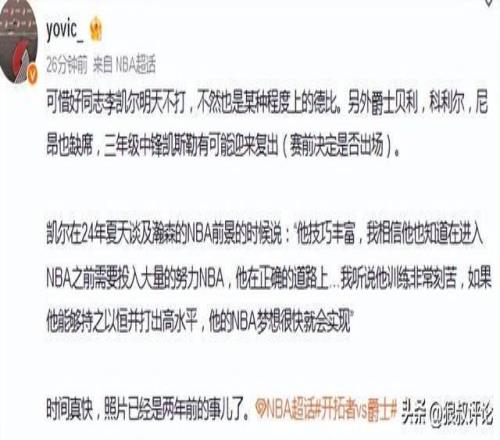 “yovic”原话说道:可惜好同志李凯尔明天不打,不然也是某种程度上的德比。另外爵士贝利,科利尔,尼昂也缺席,三年级中锋凯斯勒有可能迎来复出(赛前决定是否出场)。