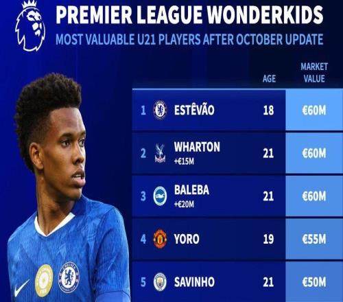 德转:切尔西三新星进英超U21身价榜前十,埃斯特旺领衔